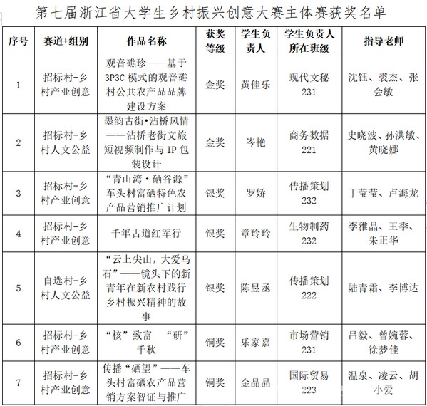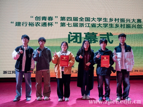 11月22日,“建行裕农通杯”第七届浙江省大学生乡村振兴创意大赛闭幕式在浙江同济科技职业学院举行。学校荣获金奖2项、银奖3项、铜奖2项,实现本项赛事获奖数量又一新的突破。